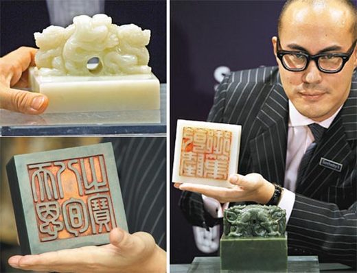 香港蘇富比將於十月八日舉行秋季拍賣會,乾隆御寶交龍鈕白玉璽、和闐青玉璽,是眾所矚目的拍賣焦點之一,估價超過港幣七千萬元。(右) 白玉璽(左上)刻有「隆御筆」字,印面長寬均是十二點五公分,是所有乾隆帝名號璽中最大的一方,實屬罕見,預料成交價超過五千萬港元。和闐青玉璽(左下),上刻有漢文篆書「恩八旬之寶」字,是乾隆五十五年,為慶祝乾隆八十大壽而雕製,預料成交價超過兩千萬港元。 【2008/08/27 聯合報】(看新聞原文)乾隆玉璽 要拍賣了