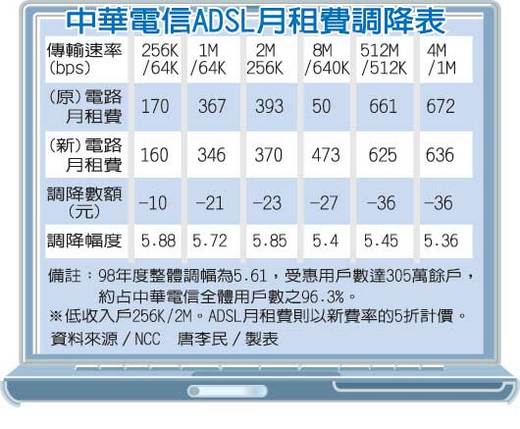 國家通訊傳播委員會 (NCC)上午核定通過中華電信ADSL月租費調降案,整體調降幅度為5.61%,預估約有305萬用戶受惠。其中256K降幅最大達5.88%,另外512K與4M則同時調降36 元,但仍與消基會要求大幅調降ADSL月租費的期望,有相當大落差。