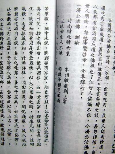 哈哈!有人為我作《濟公傳》者,竟說我喝酒吃肉,甚食狗肉等葷腥,猶幸未說,濟顛娶有家室,則更可駭!此本俗本以訛傳額,真是可笑,按老衲出世,便去宿根,故一意出家,經眼瞎堂長老點化。後方知前身乃是紫金羅漢,以大宋國難之時,特來凡間,挽回氣數,由是抹藏本相,詐酒佯狂,指點頑愚,開化頹風,後人咸以濟顛亦吃酒肉之說,真失之毫釐,差之千里矣,世有規戒之俗僧,決無飲酒吃肉之羅漢。子等稱我為佛,當審此以名譽時,此諭」