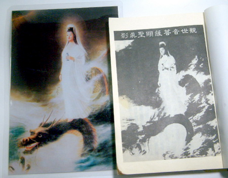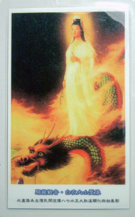 台灣最常見一款觀音手持淨瓶楊柳騎龍的法像。這像據傳是1959年八七水災時,觀音菩薩在台灣大肚溪顯聖時,被當時巡視災情的直昇機拍下黑白照片。後經畫家繪成彩色畫作,甚至還為著作權鬧上法院,經法院判決有案。在台中聖賢雜誌社出版的《觀世音菩薩傳》中就有這張照片。在維基百科也有關於《騎龍觀音像》之敘述。