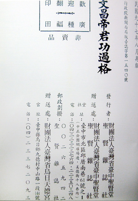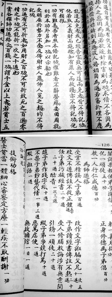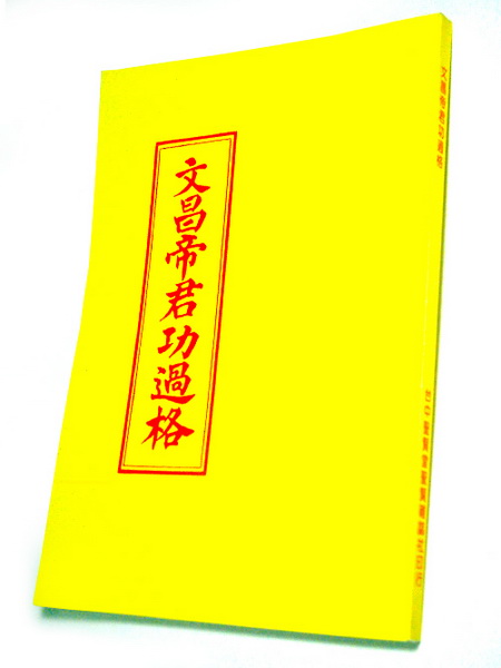 古人用黃黑豆表功過,每日自省修身。然功過定義,隨教化各有不同,如貪污建國有人謂之功;有人多妻謂非過。因此便有「功過格」的書冊,以明功過。《文昌帝君功過格》便是代表作之一。文昌帝君掌管考試,學生跟報考公教人員者,應該多少都去求過。此本功過格為民國初年重印,序文寫於雍正二年,但其記載之「靈驗記」又出現宋代范仲淹等人。成書日期可能更早。