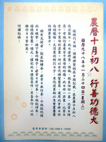 文宣的意思是,農曆十月初八這一天中,若能吃素、行善,可以得到諸天神聖的護持。吃素一天,等於吃素一年的功德;放生或作善事一元即等於一千元;若是說一句好話,等於說一千句好話。同樣地,若是罵人一句,就等於一千句。