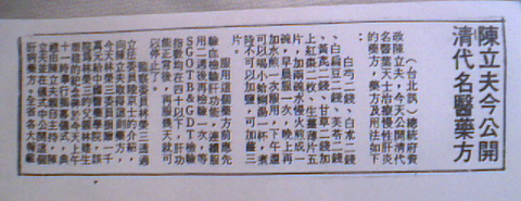 一款清代名醫葉天士的治肝病藥方,因陳立夫用此方治癒了自由時報老闆林榮三的肝炎而受到矚目。此方有時也會出現在寺廟供人索取,YOYOMAN在此與大家分享作為參考。原文如下,報導日期不詳,林榮三得到肝炎是擔任立委期間(1975-1980年間),自由時報創於1986年,所以說自由時報是因為這個藥方才得以創辦也不為過。聯合滋事庫並在文末附上當年民生報相關報導,歡迎多多傳送,救人一命功德無量: