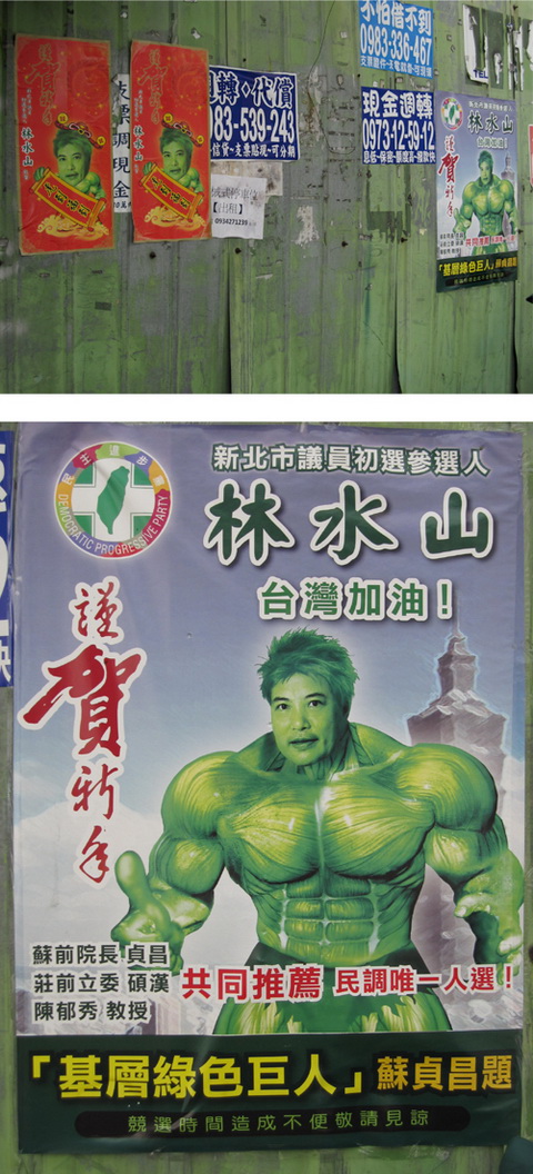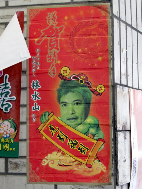李安以前拍「綠巨人浩克」,那時候民進黨就有意跟美國洽談綠巨人的造型版權,作為選舉吉祥物。結果當然是不可能。現在倒是民進黨裡有人自己扮成綠巨人參選。這人叫林水山,還印了一個拜年的春聯。上面就是他綠巨人財神造型。(圖一、三、四)