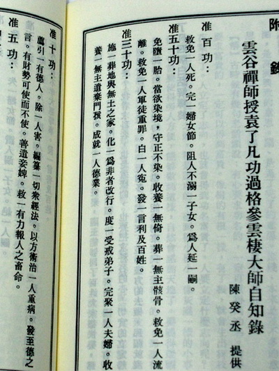 讚一人善。掩一人惡。勸息一人爭。阻人一非為事。濟一人饑。留無歸人一宿。救一人寒。施藥一服。施行勸濟人書文。誦經一卷。禮懺百拜。誦佛號千聲。講演善法,諭及十人。興事利及十人。拾得遺字一千。飯一僧。護持僧眾一人。不拒乞人。接濟人畜一時疲頓。見人有憂,善為解慰。肉食人持齋一日。見殺不食。聞殺不食。為己殺不食。葬一自死禽類。放一生。救一細微濕化之屬命。作功果薦沉魂。散錢粟衣帛濟人。饒人債負。還人遺物。不義之財不取。代人完納債負。讓地讓產。勸人出財作種種功德。不負寄托財物。建倉平糶、修造路橋、疏河掘井、修置三寶寺院、造三寶尊像及施香燭燈油等物、施茶水、捨棺木一切方便等事。自「作功果」以下,俱以百錢為一功。