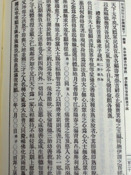 弟子○○○同室人○○○痛世道之危岌,愍人心之陷溺,愈趨愈下,了無底止。仰冀大士賜我福德智慧之子,以期將來窮則獨善,以倡導於一鄉。達則兼善,挽狂瀾於既倒。特立三約,以為先容。一保身節欲,二敦倫積德,三胎幼善教。勉行此三,以期無負大士之洪慈也。又祈四海內外,一切同人,咸息惡心,咸發善念。咸生福德智慧之子,咸體普覆並載之仁。視鄰邦如手足,以天下為一家。互相維持,不相侵暴。以期上慰乾父坤母之洪恩。下符與天地並稱三才之人名。轉大亂為大治,普天同慶。暢佛化於兩間,萬國咸寧。唯願菩薩,普施無畏,愍我愚誠,滿我所願。