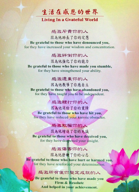 廟裡除了佛經流通外,也有不少善心人士印製的格言,其中「生活在感恩的世界」就是很有名的系列。這次特別找到中英對照的跟大家分享: