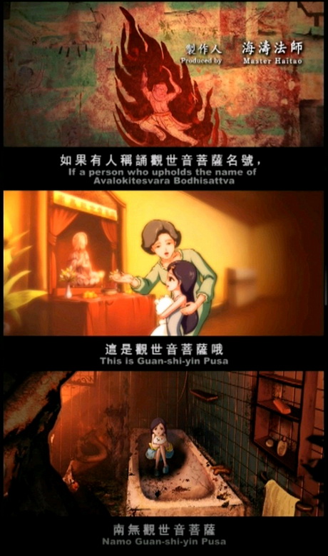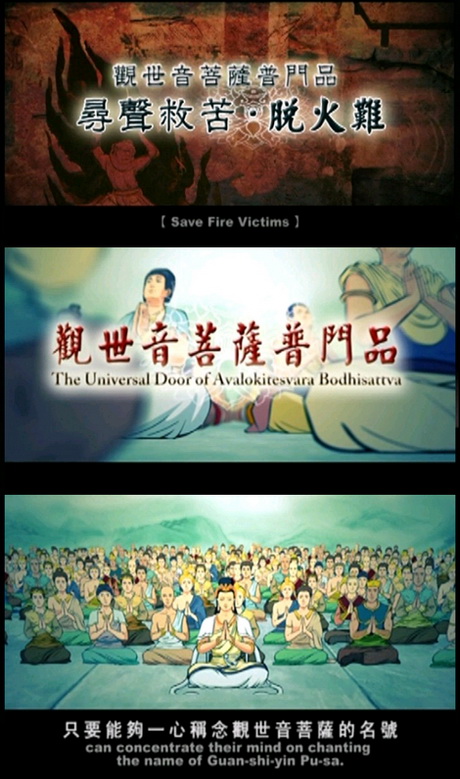 《觀世音菩薩的故事》中有一系列改編自《觀世音菩薩普門品》的短片。〈尋聲救苦:脫火難〉就是改編自普門品中兩段持誦觀世音菩薩名號可避火難的經文: