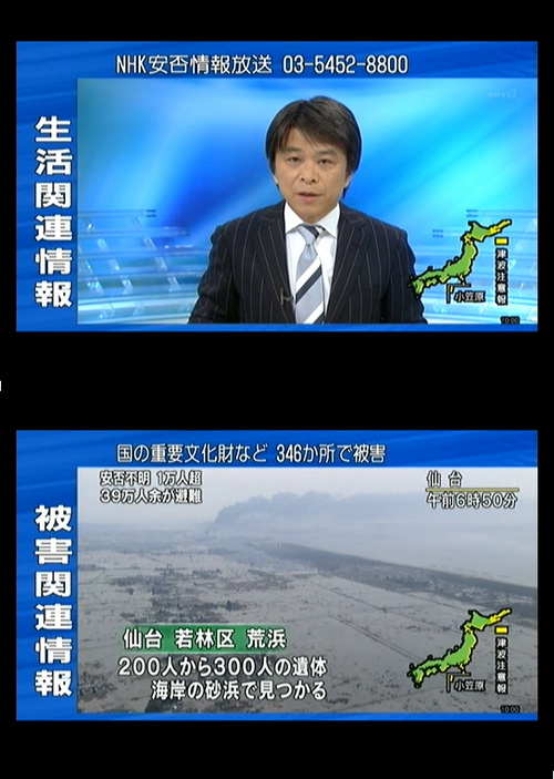 米果地震之後NHK即時呈現的空拍畫面,冷靜而詳實提醒海嘯的正確訊息,「即使某些主播跟記者的聲音有些顫抖,但是他們知道包括災區民眾跟全球日本人都很注意這些消息,他們必須鎮定,因為這是最重要的訊息來源。」她寫說,沒有災民呼天喊地的畫面,沒有記者跑去災區大呼小叫的搞笑,但是對於訊息傳遞,政府政策發佈,甚至每隔幾分鐘就提醒觀眾注意安全,她說,NHK真是個讓人欽佩的媒體。