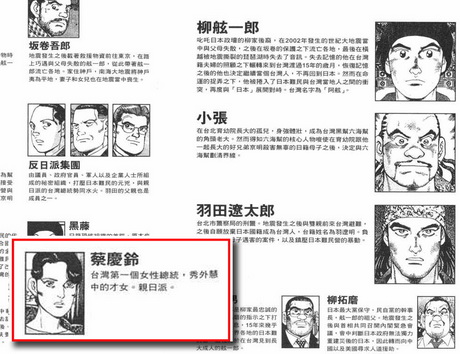 《太陽默示錄》是《沉默的艦隊》作者川口開治作品,主要人物命名都與三國時代有關。如柳(劉)舷一郎、(關)羽田、小張等等。除了設定201x年的台灣由秀外慧中的親日女總統「蔡慶鈴」執政,故事背景是日本在遭受四大強震後,富士山爆發,國土從本州斷裂成兩半。跟當今局勢若有似無的巧合,值得蔡英文推薦給「首投族」啊!