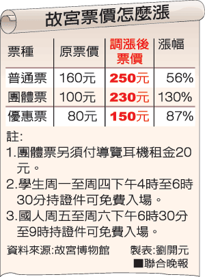 馮明珠說,故宮奉核可調漲的因素包括,原開館時間由「朝九晚五」延長為上午8點半至下午6點30分,周五、六更延至晚上9時,導致各項成本大增,如臨時人力97年前無該項支出,但101年已達3500萬元,電費由97年的3520萬元,增加至101年的4700萬元。