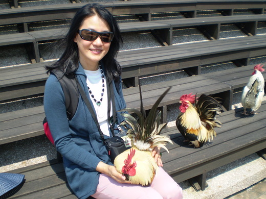 滿有趣的,雞會與陌生人互動!這三隻公雞是信徒送來此放生的 . 據廟中出家人述說已飼養了好幾代這樣的公雞; 他們大約每一個鐘頭就會雞鳴數次; 好似在頌經般 ;且看見訪客拿著相機就會擺上最好看的姿態,供人拍照 . 也會讓人抱抱且撫摸 ;真是可愛極了! 每次造訪一定去探望牠們 ; 更有意思的是; 牠們如喜歡你; 當你離開時牠們還相陪伴送客一段路; 並一 路雞鳴; 妙不可言!