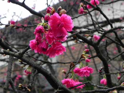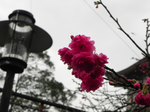 緣道觀音廟園內小停車場旁一排櫻花盛開中,雖然植株不大,但是還是喜氣一片,奼紫嫣紅! 大都是台灣山櫻花緋寒櫻與八重櫻,應該可維持各把月的開花期吧! 廟大門口有幾株吉野櫻則尚在蘊釀花苞中,開花期可能要到3~4月。