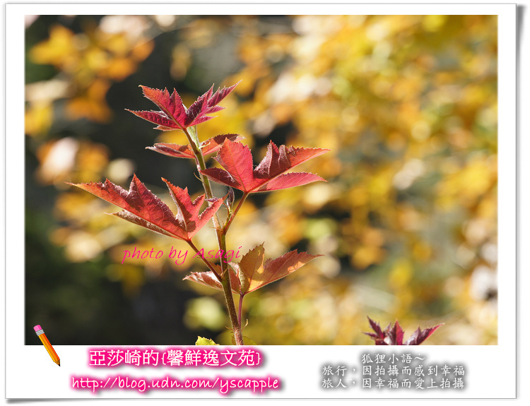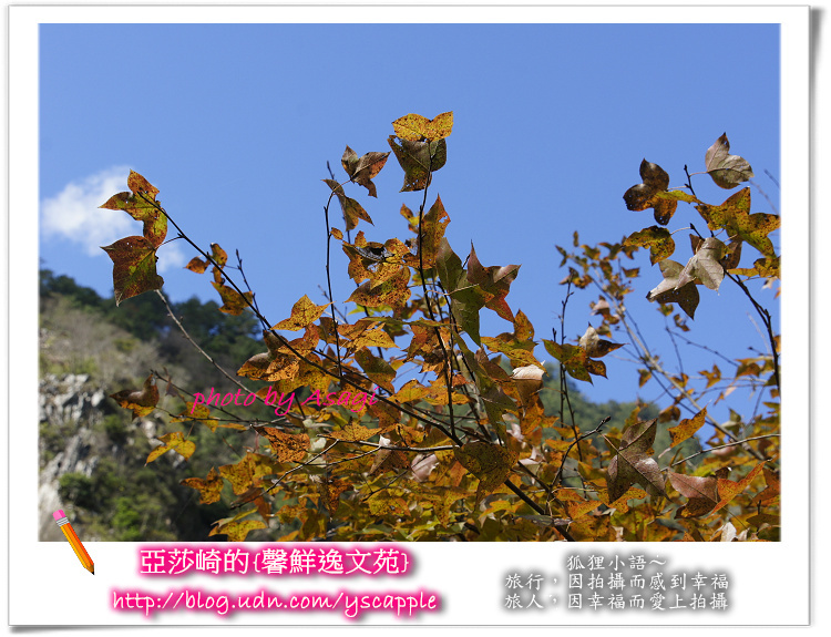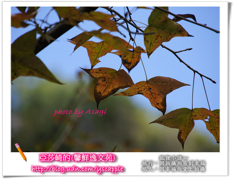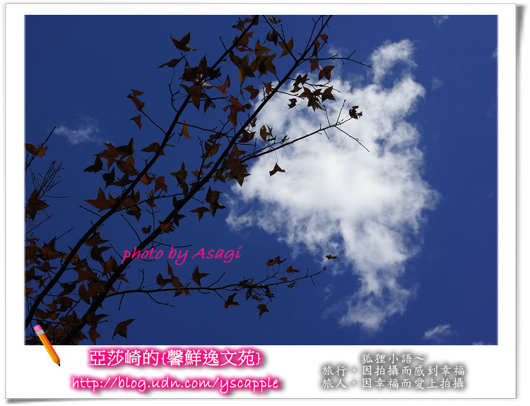 秋天山野間的楓紅,在這冬日似乎來不及欣賞,但有幾葉楓葉羞紅了臉,對藍天微笑。