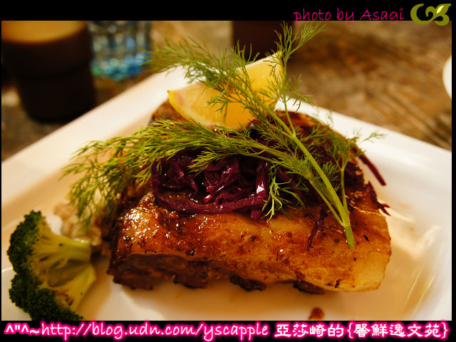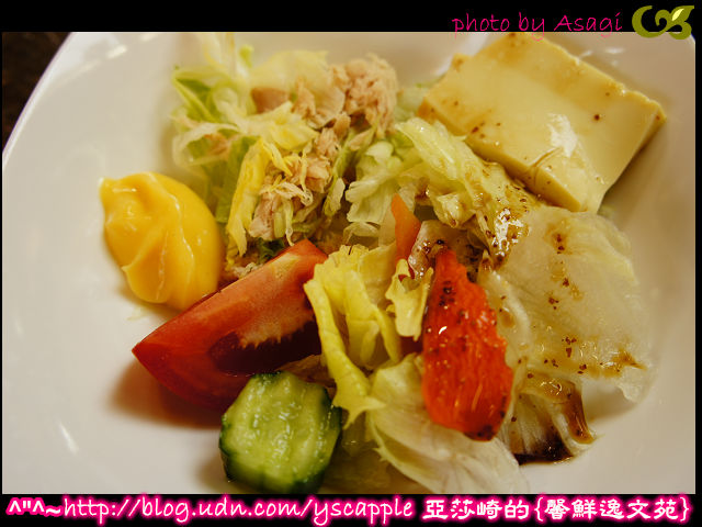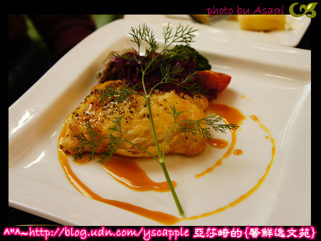 畫面餐盤左邊那坨黃澄澄的就是柳橙醬,^"^亞莎崎很喜歡這邊主廚調製的柳橙醬,那種一入口就立刻散開在口中的水果芬芳相當濃鬱,會持續在味蕾上與新鮮蔬菜融合,使這盤沙拉的味道更加分。