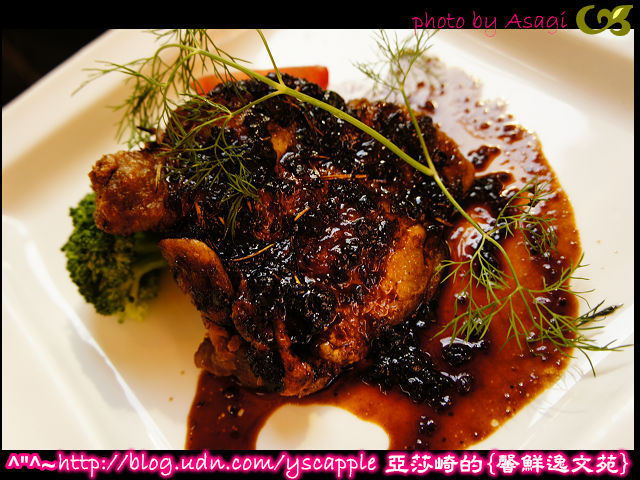 迷迭香烤雞覆紅酒黑醋梅汁主餐。