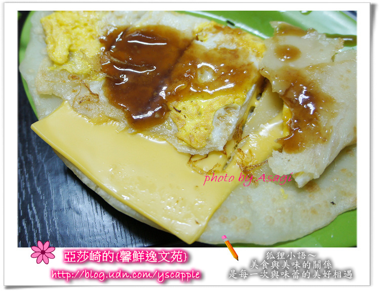 反正,重點是這裡的餅皮啦!這種麵漿做成的蛋餅皮,吃起來會軟軟QQ的,對亞莎崎來說也很容易會有飽足感。看吧!是有厚度的蛋餅唷!