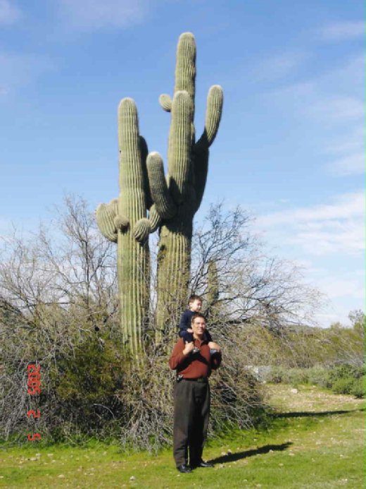記得剛到Phoenix時是在2001年的9月上旬,一踏出機場對這個沙漠城市的第一印象就是"很熱"(晚上7點多溫度還高達攝氏42度!)且極為乾燥。其次就是沿路上所看到各式各樣的巨大仙人掌,其中又以Saguaro (發音sah-wah-ro)最讓人驚豔(如圖一)。