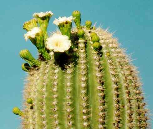 Saguaro是美國境內最大的仙人掌,其生長環境只限分佈於加州的東南部到亞歷桑那州的南部到墨西哥的西北部。大約長至2.5公尺高時,它就會開始開花。其花呈乳白色(如圖二),直徑約為8-10公分於4-5月的午夜綻放至次日中午。Saguaro的花亦是亞歷桑那州的州花。當Saguaro長至6公尺(約65歲)時會開始長第一枝分枝(First Arm),當它長7-8公尺時(約85歲)算是棵成樹了。而通常它的高度達12公尺時其樹齡已有200歲。