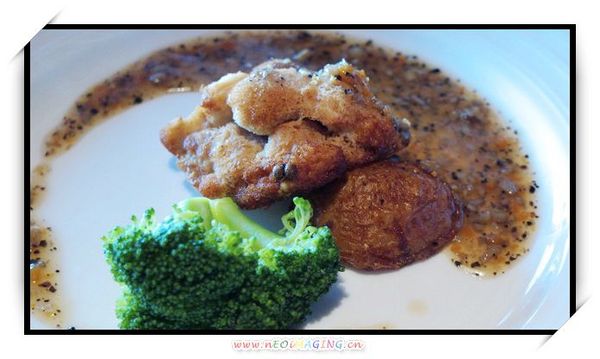 小羔羊排,傻眼,怎麼只有二小塊?一口咬下,哇塞!這羊排超~超~超~嫩,而且沒有半點羊騷味,一口羊肉一口奇異果,沾點玫瑰鹽,淡淡的鹹,淡淡的香,淡淡的酸,喔~好好吃阿!
