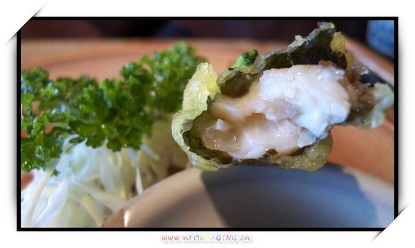 茗荷紫蘇魚捲,這道菜獲得大家一致的讚賞!日本美食節目常出現的茗荷,老實說,吃不太出來茗荷是啥味道,魚肉超多汁,瞧那斷面,外酥內嫩,不沾醬時嘴內有著新鮮紫蘇葉的特殊香氣,沾了金桔味增醬後又是另一種不同的享受。左下角那杯醋忘了是啥口味,清味蕾用的,酸度適中且不嗆口,超好喝,每個人都想再續一杯