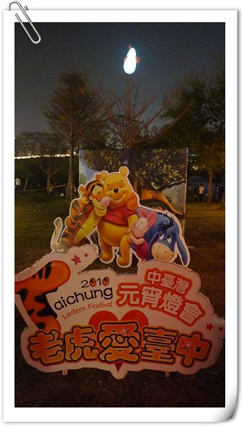 2010年的臺中元宵燈會,照例在文心路上的文心森林公園‧圓滿戶外劇場舉辦,以「跳跳虎」為主題,加上可愛的迪士尼卡通人物,肯定非常吸睛,連平日都擠得水洩不通!不過,就算這樣,元宵節當晚,還是要去湊個熱鬧~