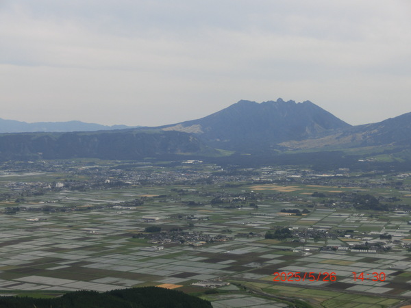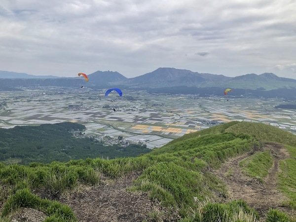 「大觀峰」海拔高度約936公尺是一處火山口外輪山的展望點,可俯瞰整個阿蘇火山破火山口的盆地,從那裡遠看阿蘇五岳(根子岳、高岳、中岳、杵島岳及烏帽子岳)排列猶如一位仰躺的大佛像,根子岳是大佛的臉部、高岳是胸部、中岳是腹部、杵島岳是膝蓋、烏帽子岳是腳;大觀峰除了是觀景平台之外也是許多飛行傘愛好者的最愛,我們到達時看到三組飛行傘在該處起降及飛行,走遍大觀峰後我們就搭車去阿蘇市的旅館而結束了旅遊的第一天行程。
