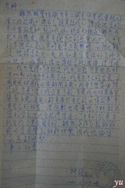 ,總是有說不出的感覺,我們似乎有許多相同之處。有時看您不高興時,心裡也難過,想讓您高興一點,我知道您是一位好老師,有心把這一班帶好,但也帶給您許多困擾,讓您煩心。我覺得對不起您,我到上冠,不是因為那邊比較好,也不是五南不好,我有不得已的苦衷,這個原因迫使我必須離開五南。我原本想當面跟您說,考慮了很久我還是不敢,其實我也非常希望留在五南。每個人都有屬於自己的心情故事,保有自己的秘密,很抱歉也很遺憾不能做為您的學生,但我會記得您這二個月來的教導,有機會我還是會回去的。雖然沒趕在教師節前與您道聲教師節快樂,但我祝福您