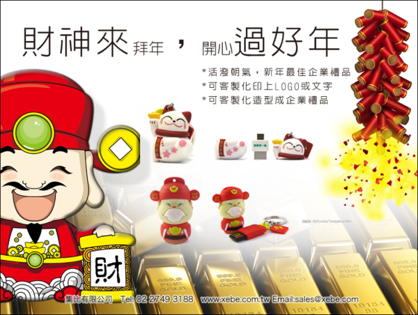 财神爷u盘,喜气洋洋的感觉,让人在新的一年看到都不自觉的心情变好了呢!实用礼品造型特别,最适合做为送给客户的礼物,可以在u盘内先内建企业的官方网页,让收到礼物的人印象更为深刻唷!