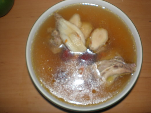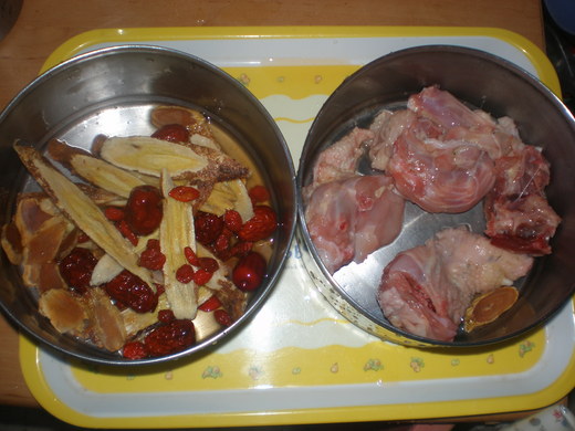 養身雞湯:枸杞、紅棗、黃耆、洋蔘、雞肉洗淨,混在一起→加水,放置電鍋煮大約二十分鐘→加少許的鹽(真的只有一點點)→完成。