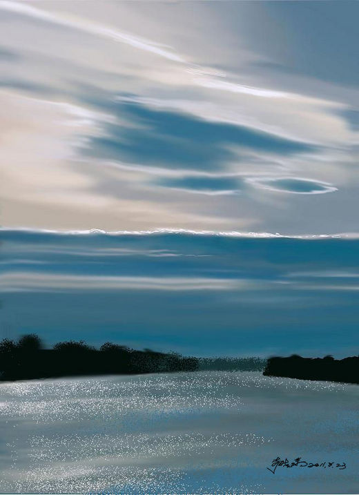 我從小至今最喜歡藍色,因著它深遠寂靜的表情,給予我心靈帶來平和以及無限遐想的空間,其實這畫的藍色如果少了波光粼粼點亮了碧,那麼就比較接近蔚藍,不是三原色而係『中間色』,是我們對三種以上顏色混合的顏色慣習稱呼,柔和耐看,是協調後的結構吧。