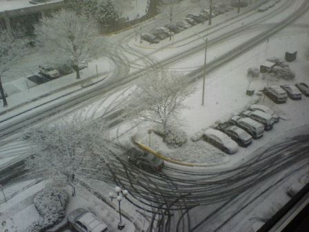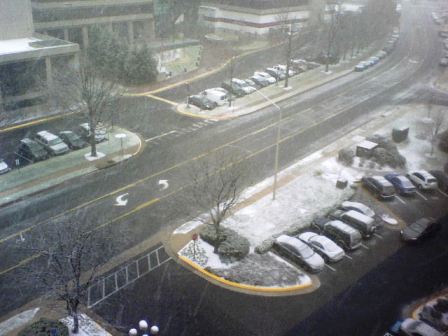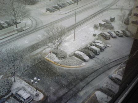 果真到了十點多,窗外開始飄起雪花,圓媽分別在十點半、十一點、十一點半從八樓的辦公室照窗外的街景,前後比較一下,雪還積得蠻快的。