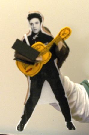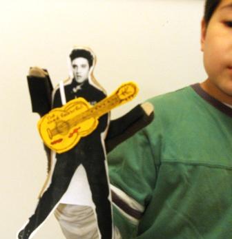 比較麻煩的是玩偶的製作,是孩子的作業,老師希望讓小孩自己做,父母可以參與給意見,必要時幫忙使用可能有危險性的工具,但不能全程幫他完成。我和圓胖都是超沒創造力的人,圓胖還因是左撇子,連剪刀都用不順手,商量討論的結果,我們決定賴皮一下,從網路找貓王的照片印出來加工。首先將照片貼在厚紙板上,再沿著人型剪好,圓胖自己畫了一個吉他貼上去蓋住原來手的部分,厚紙板的背面貼上魔鬼氈,找出一個舊的棉手套粘上去,拇指和小指做成貓王手的部分,圓胖套著手套,可以表演貓王打招呼,彈吉他。