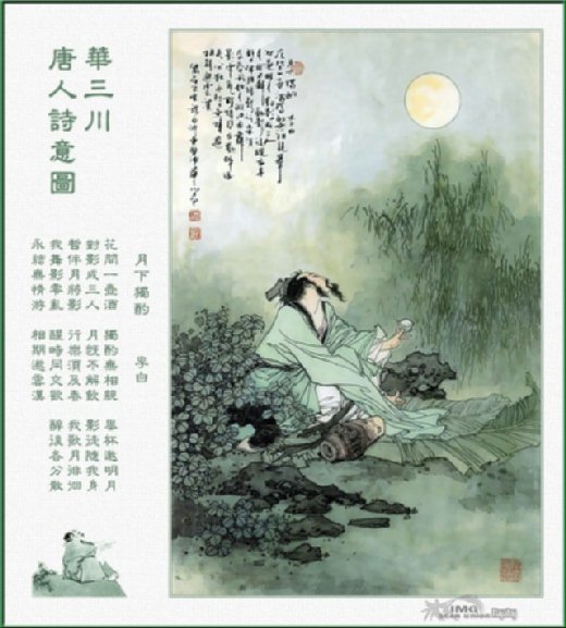 原詩共四首,此是第一首。詩寫詩人在月夜花下獨酌,無人親近的冷落情景。詩人運用豐富的想像,表現出由孤獨到不孤獨,由不孤獨到孤獨,再由孤獨到不孤獨的一種複雜感情。 李白仙才曠達,物我之間無所容心。此詩充分表達了他的胸襟。