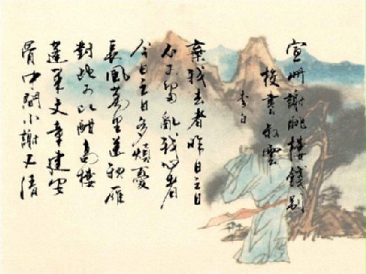 解析 : 這首著名的詩歌,在曠達豪放的背後,包含著深沉的悲哀,那是對人生的悲哀,他的人生短被這個千古以來難以解決的矛盾苦惱著。李白說他的愁是「萬古愁」,他想借酒消愁,但是我們不禁要問:這萬古愁是能用酒消掉的嗎?正如他自己所說:「抽刀斷水水更流,舉杯消愁愁更愁。」詩旨在以蓬萊文章比李雲,以謝朓清發自喻。借送別以贊對方,惜其生不稱世。開首二句,不寫敍別,不寫樓,卻直抒鬱結,道出心中煩憂。三、四句突作轉折,從苦悶中轉到爽郎壯闊的境界,展開了一幅秋空送雁圖。“送”,“酣”,點出了“餞別”的主題。“蓬萊”四句,讚美對方文章如蓬萊宮幽藏,剛健遒勁,有建安風骨。又流露自己才能以謝朓自比,表達了對高潔理想的追求。同時也表現了詩人的文藝觀。末四句抒寫感慨,理想與現實不可調和,不免煩憂苦悶,只好在“弄扁舟” 中去尋求寄託。思想感情瞬息萬變,藝術結構騰挪跌宕,起落無端,斷續無跡,深刻地表現了詩人矛盾的心情。語言豪放自然,音律和諧統一。“抽刀斷水水更流,舉杯銷愁愁更愁”句,是千百年來描摹愁緒的名言,眾口交贊。