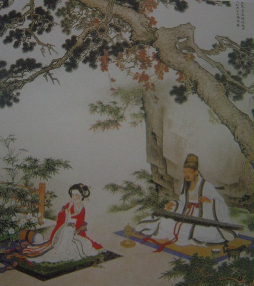 蜀中山明水秀,地靈人傑,孕育了不少出色的文人雅士,司馬長卿(相如)便是其中的一位。他因慕戰國時代趙國藺相如的為人行事,以「相如」作為自己的名字,也立志要為國家作一番轟轟烈烈的大事。漢景帝即位不久,司馬相如來到長安,相如家境小康,用錢捐了個小官(史記稱作「以訾為郎」,「訾」音支,錢財也;「郎」為帝王侍從官的通稱),為武騎常侍,服侍漢景帝。他本有才華,寫得一手好辭賦,無奈生不逢時,景帝不喜辭賦,大官做不成,終日與梁孝王之「傍友」為伍,花錢如流水,期間撰《子虛之賦》。遇到頗有書卷氣息的梁王,當時名重一時的辭賦大家鄒陽、枚乘、嚴忌等都追隨左右。司馬相如十分傾慕,便追隨梁王而去。在梁地作賦彈琴,生活過得十分得意。梁王盛讚其才情高華,賜給他一把名叫綠綺的琴,上面刻有「桐梓合精」的字,是當時不可多得的名貴樂器。這把琴就是後來司馬相如用來彈奏「鳳求凰」,卓文君聽後夜奔的那把琴,所謂「綠綺傳情」使這把琴更富傳奇色彩。