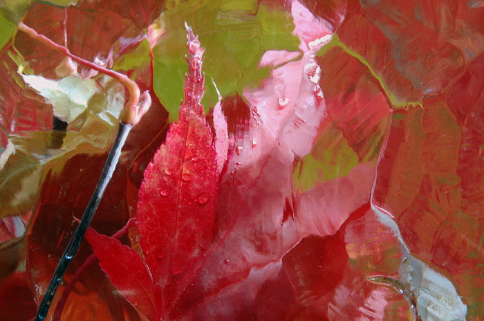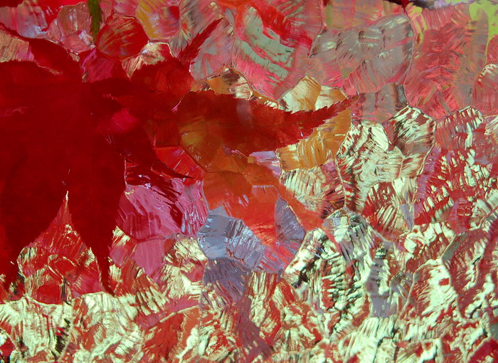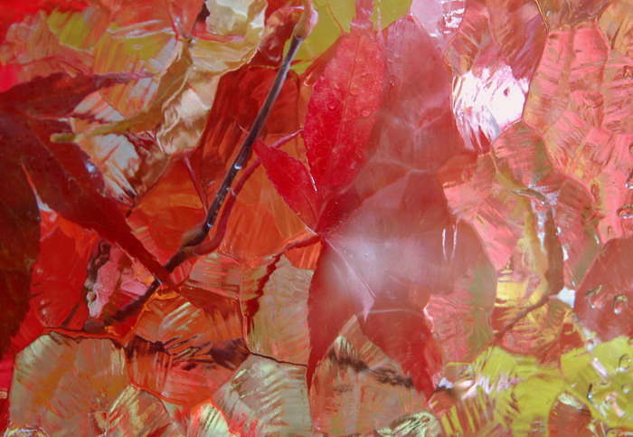 結晶狀的毛玻璃折射出很好的背景顏色,在可以辨識的秋葉左右,
