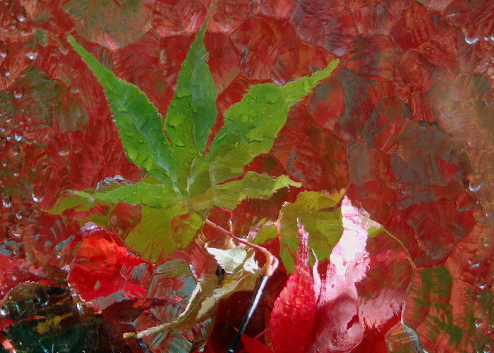 明顯比其他楓葉瘦小的身影,含住雨滴數顆,而終於露臉的夕陽,灑了些許睛朗,點綴其旁,她,更綠了,在本該屬於紅色的畫布上。