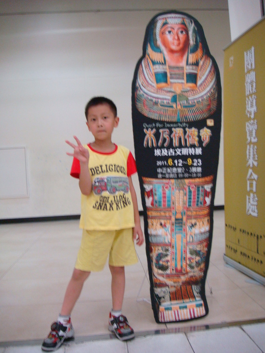 兒子喜歡閱讀, 更喜歡找答案, 他常常發現書本上的錯誤然後追著我問, 我只好打給出版社請他們更正. 自從蘇州回來後, 我們更能體會到書本上的知識固然豐富, 可是實際看到的感觸更深. 所以回台後知道 [ 木乃伊展 ] 即將結束, 就快速安排行程去參觀. 我們利用周五孩子們上半天課的時間, 中午接了他們, 搭乘大巴士轉捷運到中正紀念堂, 利用下午的時間參觀, 可是參觀人潮仍然多, 真的可以感受到 [ 埃及王子 ] 的魅力.