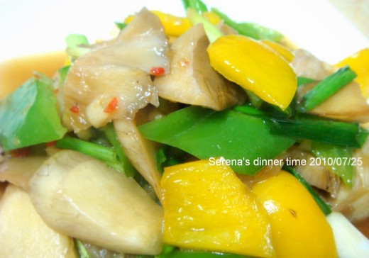 1. 將青椒甜椒切斜刀塊,鮑魚姑也切相同斜刀塊備用,需顧及相同尺寸會叫好入口。