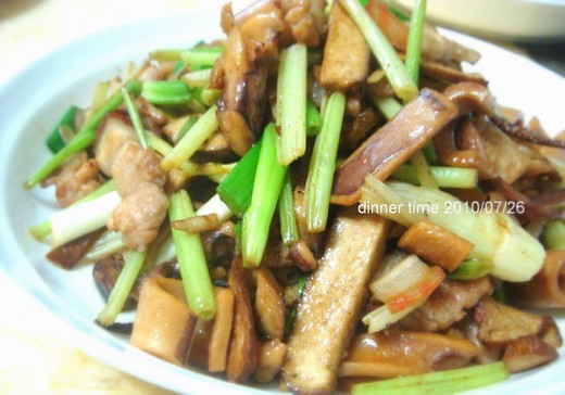 芹菜1/2把、五香豆干2片、乾魷魚1/2條、五花肉1/2條(約半斤)