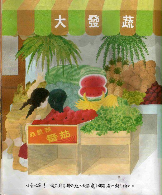 總之,在小女孩充滿想像力的視線下,牆壁的磁磚有如「長頸鹿」,樹幹、樹枝會像「無尾熊」、「人猿」、「大象」,樹叢會像「豪豬」、「孔雀」、「羊駝」,有的石頭還像「犀牛」,洗衣店櫥窗裡的集衣袋看起來像一群「魚」,蔬菜水果行西瓜的擺放像「河馬」,學校牆壁的爬藤像「蜥蜴」……諸如此類的裝置藝術效果令人眼睛一亮。