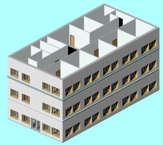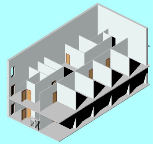 建築物的另一側, 使用了非常方便的"剖面框"功能, 注意到這張圖的透視方式為整個剖面, 和前面只有牆壁隱藏而窗戶還在的圖片較能完整觀察裡面的構造. 剖面框的設定在普通視窗下按右鍵-性質, 在裡面有一個"剖面框"的選項, 勾選即可. 啟動之後就會再您的建築物上出現一個包覆整個物體的立方體, 調整立方體的大小, 超過立方體的物件都會被剖面. 此功能用於展示一棟建築物內部時可以活用, 可以省掉大量時間來隱藏物件.