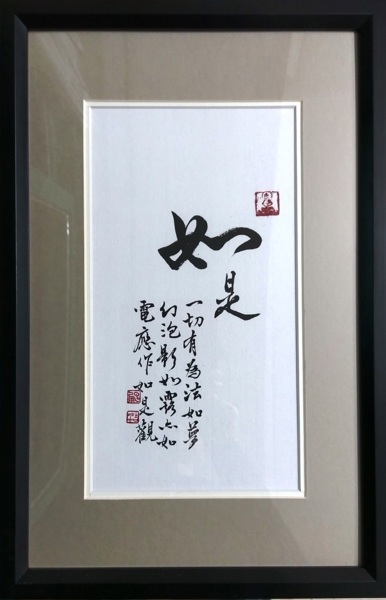 這幅字的緣起還得感謝另一位好友明原,為了答謝他幫我拍了許多精彩的照片,答應回敬一幅字送他,明原指定主字「如是」,我輔加小字以《金剛經》的句子:【一切有為法,如夢幻泡影,如露亦如電,應作如是觀】為陪襯。完成後,深深覺得,這幅字也很適合送給麗貞姐呀!於是徵得明原同意,二幅相同的拙作就這麼與麗貞姐和明原二位大德結緣了!