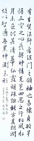 書法除了是中國文字點、線的藝術,也具有文學性;例如寫到褚遂良、懷仁集王羲之的〈大唐三藏聖教序〉時,更深刻感受褚遂良方圓兼備、窈窕合度的字體激賞不已;嚮往王羲之書體的精妙入神、瀟灑出塵,也為唐太宗親爲玄奘大師寫序而感佩萬分,尤其每當寫到「松風水月,未足比其清華;仙露明珠,詎能方其朗潤……」時,心悅誠服於玄奘大師的人品高潔。臨寫趙孟頫的前後〈赤壁賦〉,神迷於他細緻華美的線條外,更感於蘇東坡對生命領悟的情懷,「蓋將自其變者而觀之,而天地曾不能一瞬;自其不變者而觀之,則物於我皆無盡也。」是面對人生無常的瀟灑與達觀。臨貼除了臨摹筆意字態,更希望透過筆墨傳情,也能瞻仰這些大師的風範。