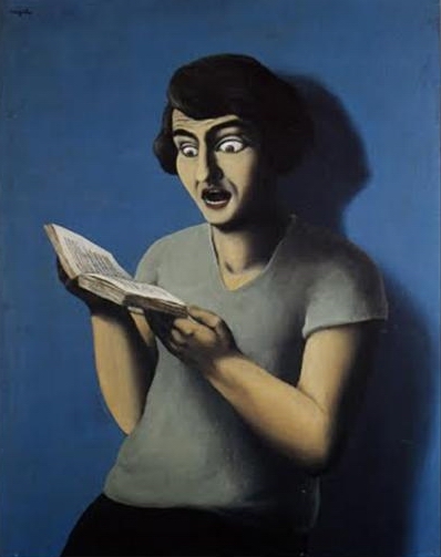 在演講的尾聲,楊佳嫻老師仍以雷內•馬格利特的作品做為ending。「The Subjugated Reader」這幅作品中的人物睜著大眼、滿臉驚奇地看著一本書,楊佳嫻老師表示,詩作品最終的目的應要像這幅畫代表的意涵,除了要涵蓋抒情,還要令人感到驚奇。