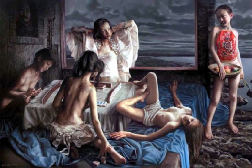 因此,散客連想到加拿大華裔畫家劉溢的《搓麻將的女人》油畫的佈局堪可與目前弔詭的政情附會,爰隨興試作解析如下,博君一笑。