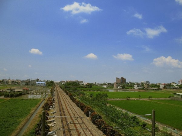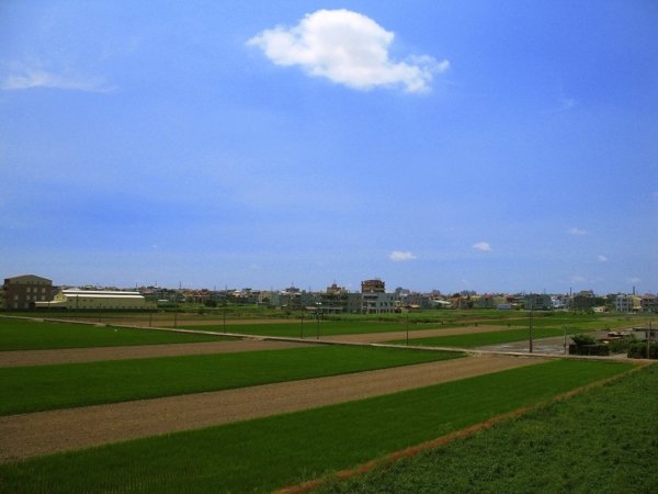 剛過正午的嘉南平原. 有湛藍的天空, 翠綠的稻田.