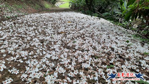 從砲台山下來,順從砲具庫、運砲坡道這端繞過來,這邊也有許多油桐花飄落..