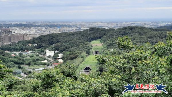 又經竹林後花崗石階緩上坡至觀景台,此處可俯瞰桃園蘆竹市區一帶,右下角處可見2個連續的高鐵隧道口,